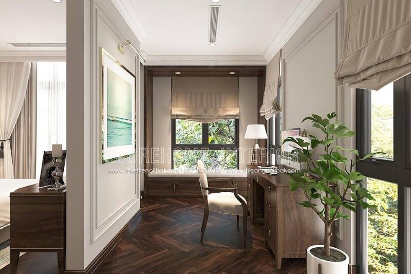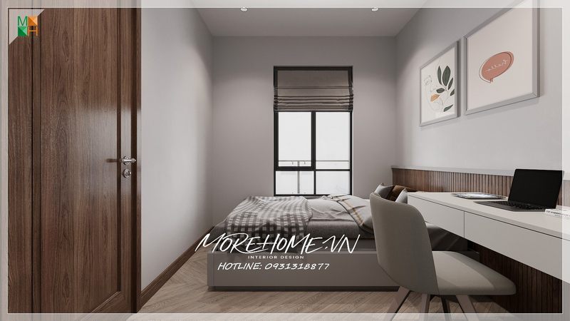 Chiếc bàn làm việc được làm từ gỗ công nghiệp có cùng tông màu với giường ngủ phù hợp với tổng thể của căn phòng