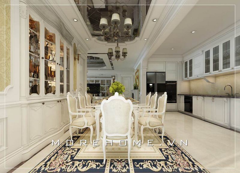 Mẫu tủ bếp gỗ màu trắng tân cổ điển chữ i tiện nghi cho phòng bếp biệt thự