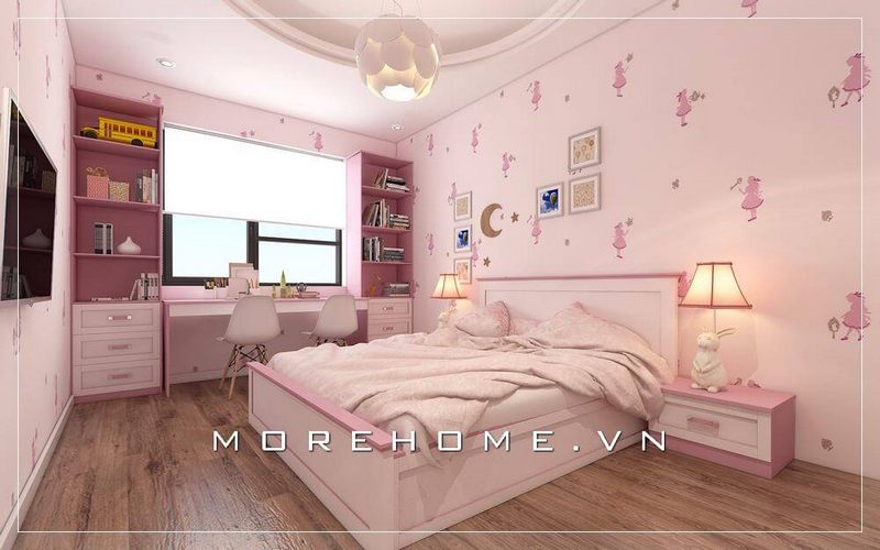 Mẫu bàn học liền kệ sách, tủ để đồ gỗ công nghiệp hiện đại cho phòng ngủ bé gái dễ thương
