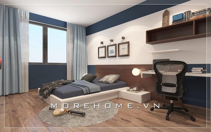 bàn làm việc gỗ công nghiệp hiện đại được thiết kế ngay tại khu vực cửa sổ căn phòng giúp con sử dụng được thêm ánh sáng tự nhiên và tập tập hơn trong không gian học tập