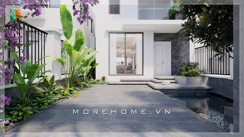 . Kiến trúc ngoại thất biệt thự cao cấp, sang trọng với cây xanh và hồ cá trước cửa nhà được thiết kế với ý tưởng mang lại sự phong thủy, tài lộc và vượng khí cho gia đình.