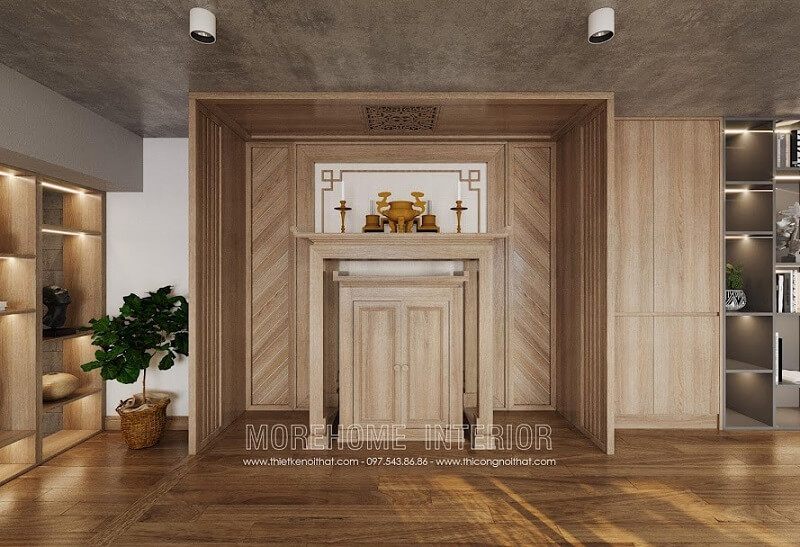 Mẫu bàn thờ được làm từ gỗ tự nhiên là sự lựa chọn hoàn hảo cho phòng khách chung cư.