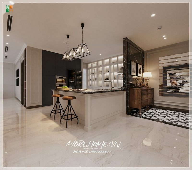 Sự kết hợp giữa hai màu đen và trắng làm chủ đạo sẽ tạo nên một mẫu thiết kế nội thất phòng bếp chung cư giúp tạo nên cảm giác sang trọng và tinh tế hơn bao giờ hết.