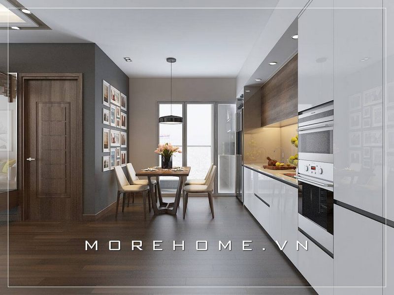 Ngoài ra, tối ưu hóa tiện ích là một yếu tố quan trọng khi thiết kế bếp nhỏ. Tủ bếp thông minh với nhiều ngăn chứa đa dạng sẽ giúp bạn tận dụng tối đa diện tích mà vẫn giữ mọi thứ gọn gàng và dễ dàng tiếp cận. Việc sử dụng các giải pháp lưu trữ trên cao hoặc kệ treo còn làm tăng khả năng sắp xếp đồ dùng mà không làm nặng nề không gian mặt bằng bên dưới.