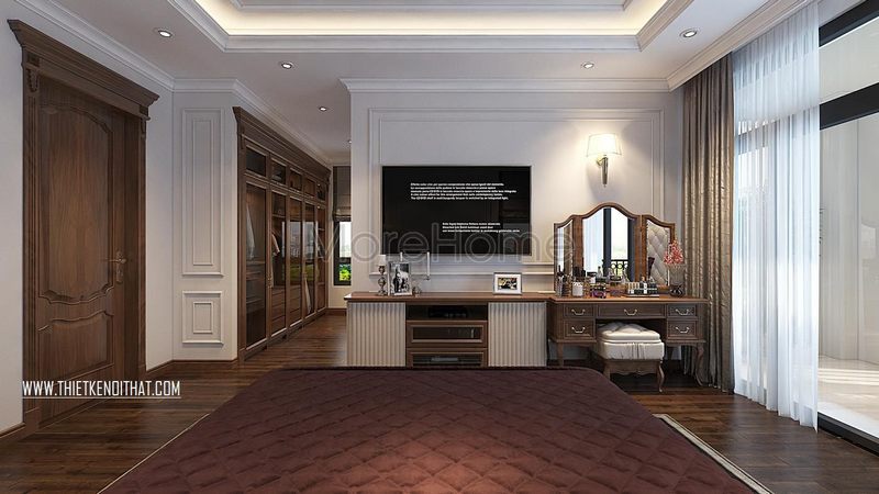 Chúng tôi đang thiết kế nội thất giường ngủ đẹp với vật liệu gỗ óc chó phong cách tân cổ điển cho biệt thự tại Hà Nội.
